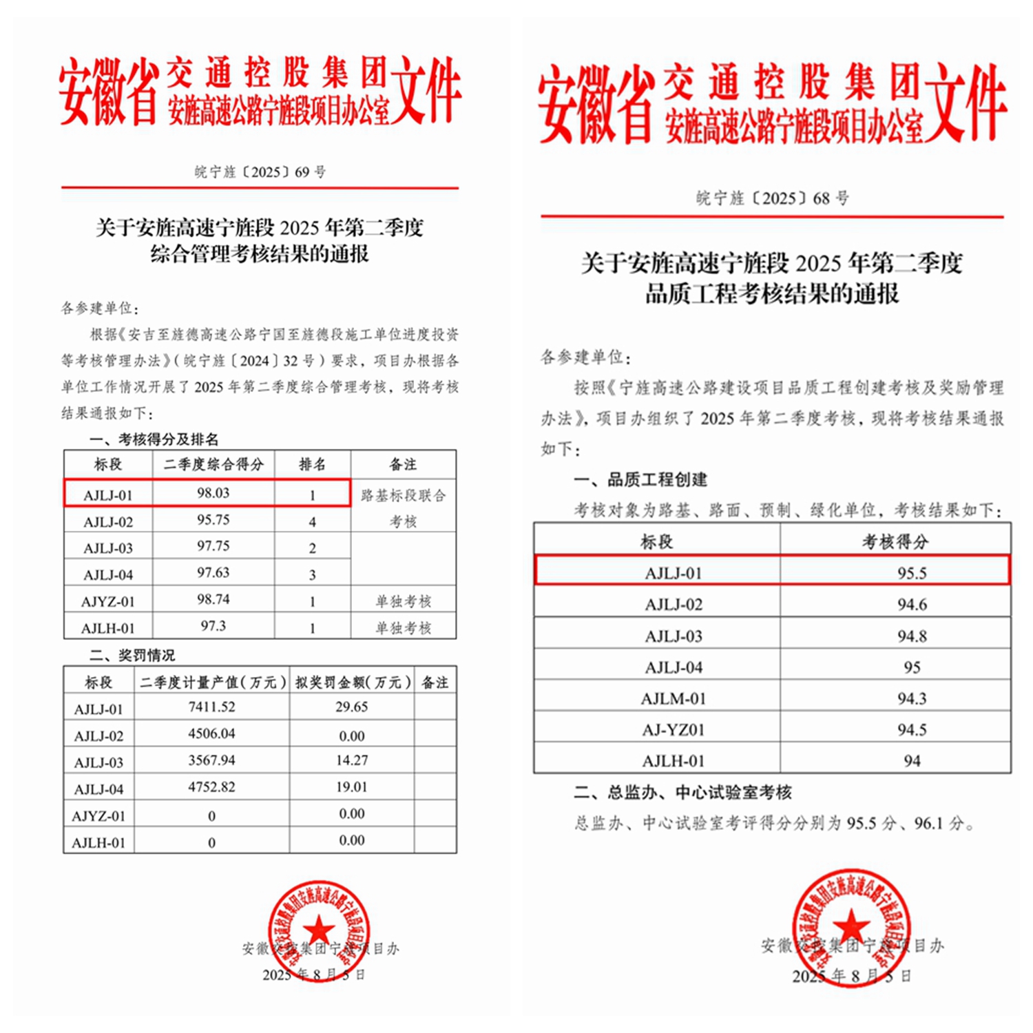近日,安旌高速寧旌段辦公室公布了2025年第二季度綜合管理考核及品質工程創建考核結果,公司承建的寧旌高速路基1標在兩項考核中均獲得施工單位“第一名”。