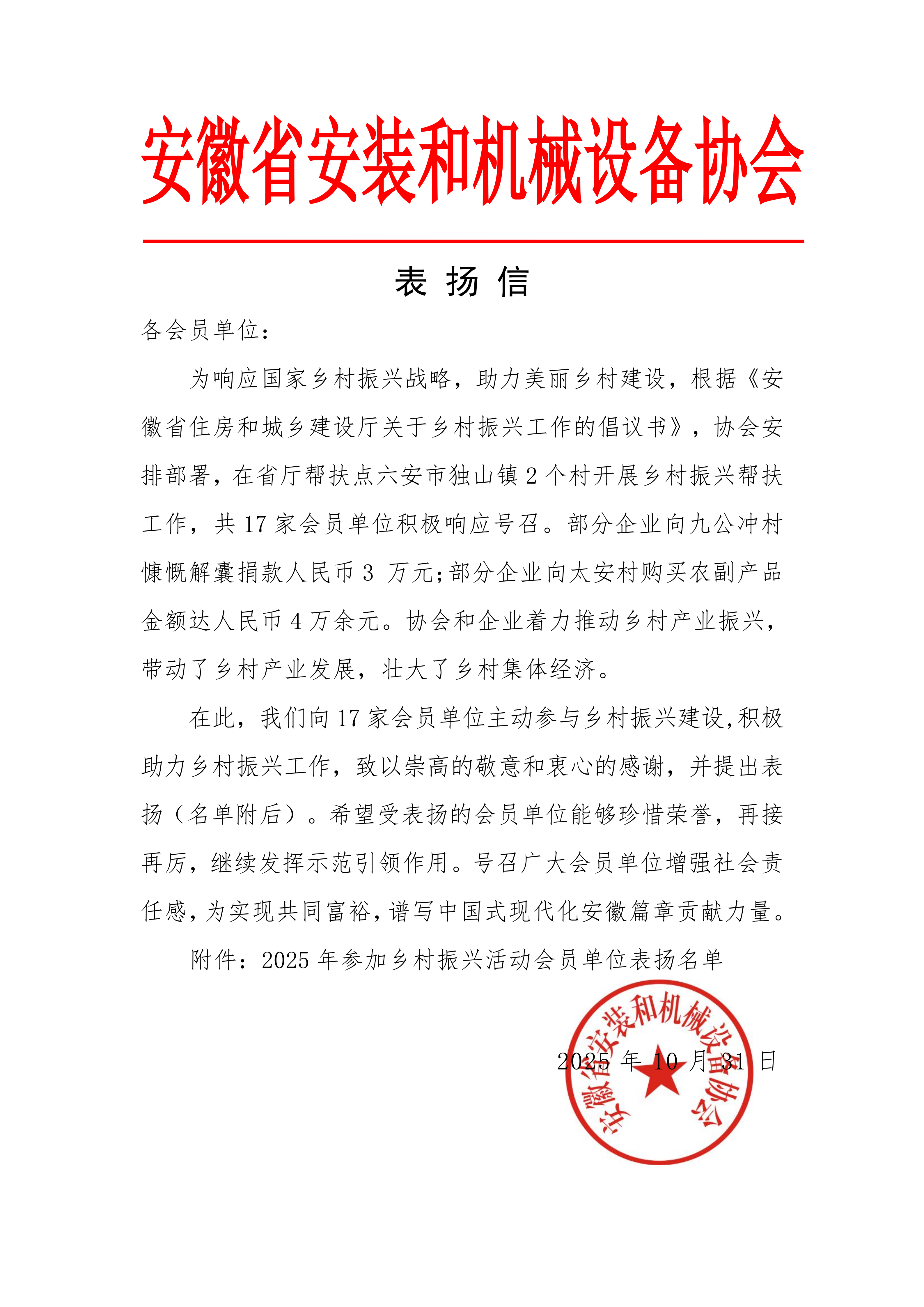 公司積極響應國家鄉村振興戰略,助力美麗鄉村建設,根據《安徽省住房和城鄉建設廳關于鄉村振興工作的倡議書》,協會安排部署,著力推動鄉村產業振興,帶動了鄉村產業發展,壯大了鄉村集體經濟。——安徽省安裝和機械設備協會