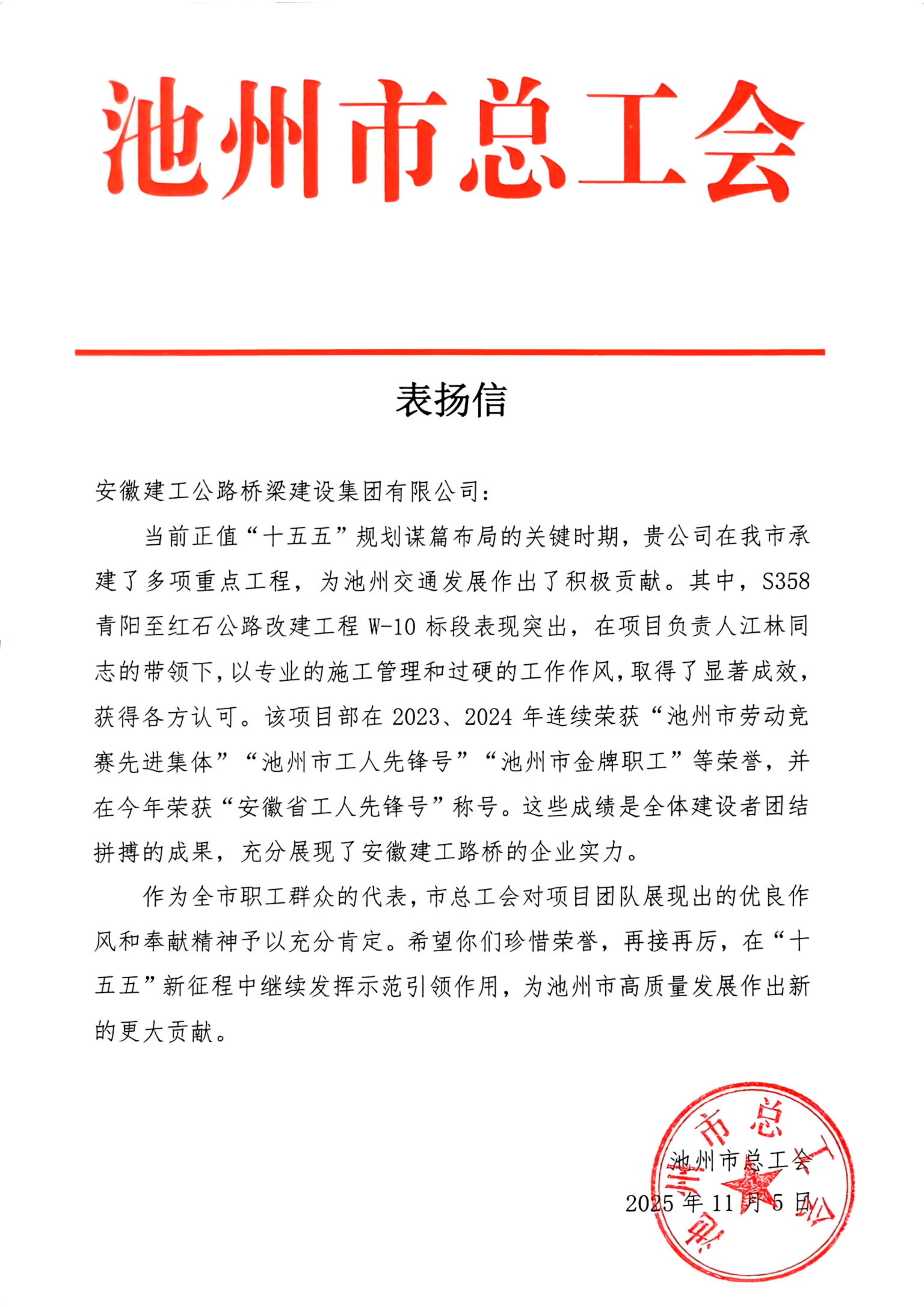 公司承建S358青陽至紅石公路改建工程W-10標段表現突出,以專業的施工管理和過硬的工作作風,取得了顯著成效,獲得各方認可。——池州市總工會