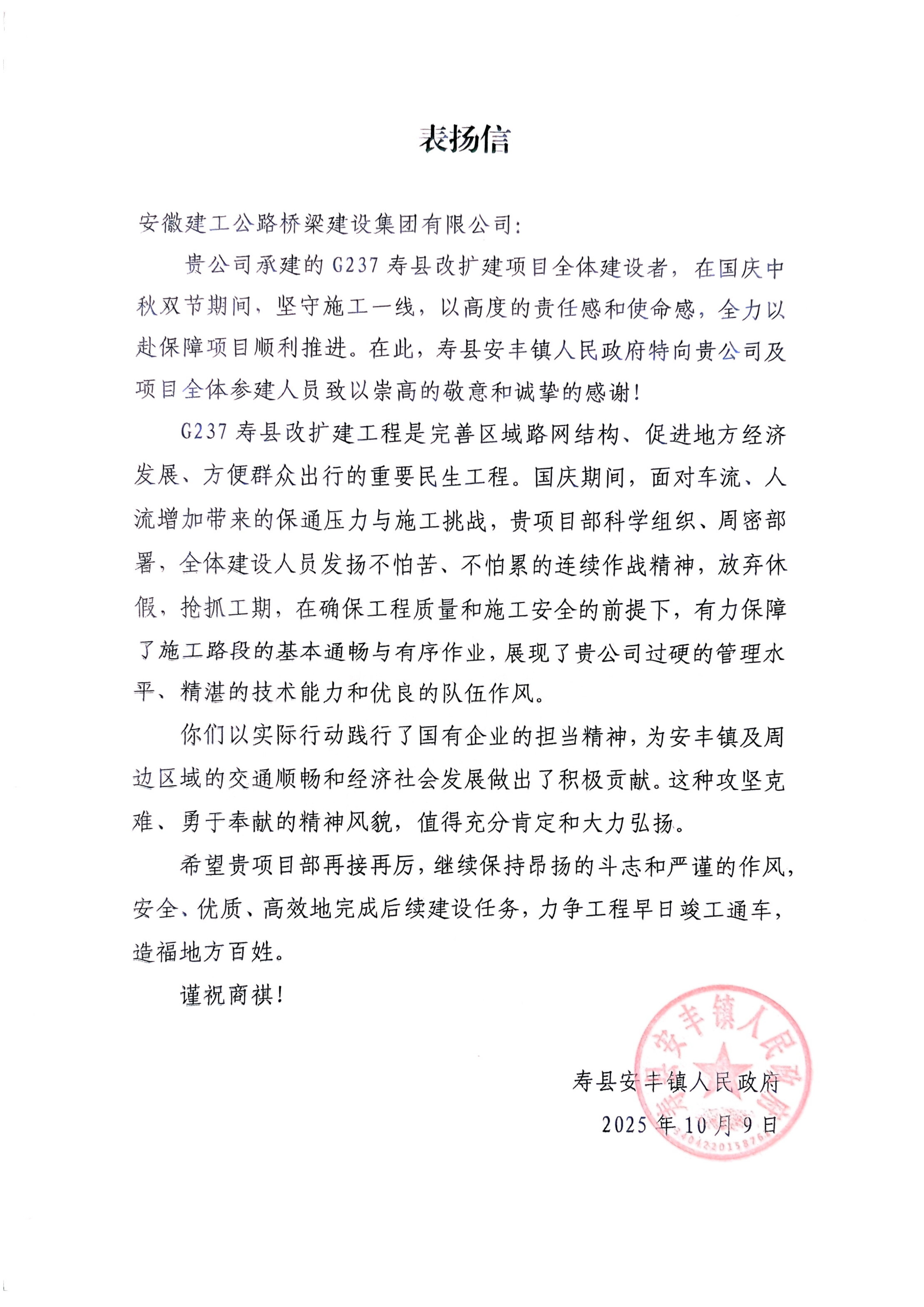 公司承建的G237壽縣改擴建項目全體建設者,在國慶中秋雙節期間,堅守施工一線,以高度的責任感和使命感,全力以赴保障項目順利推進。為安豐鎮及周邊區域的交通順暢和經濟社會發展做出了積極貢獻。——壽縣安豐鎮人民政府