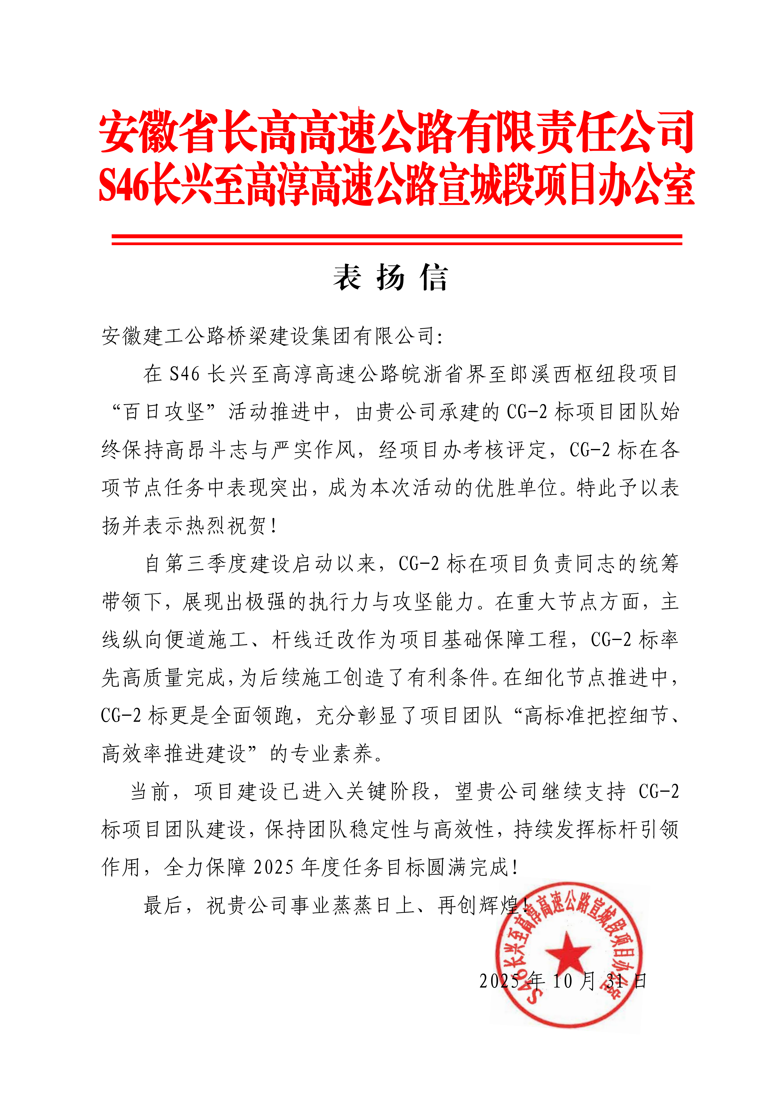 公司承建的CG-2標項目團隊始終保持高昂斗志與嚴實作風,經項目辦考核評定,CG-2標在各項節點任務中表現突出,成為本次活動的優勝單位。——安徽省長高高速公路有限責任公司