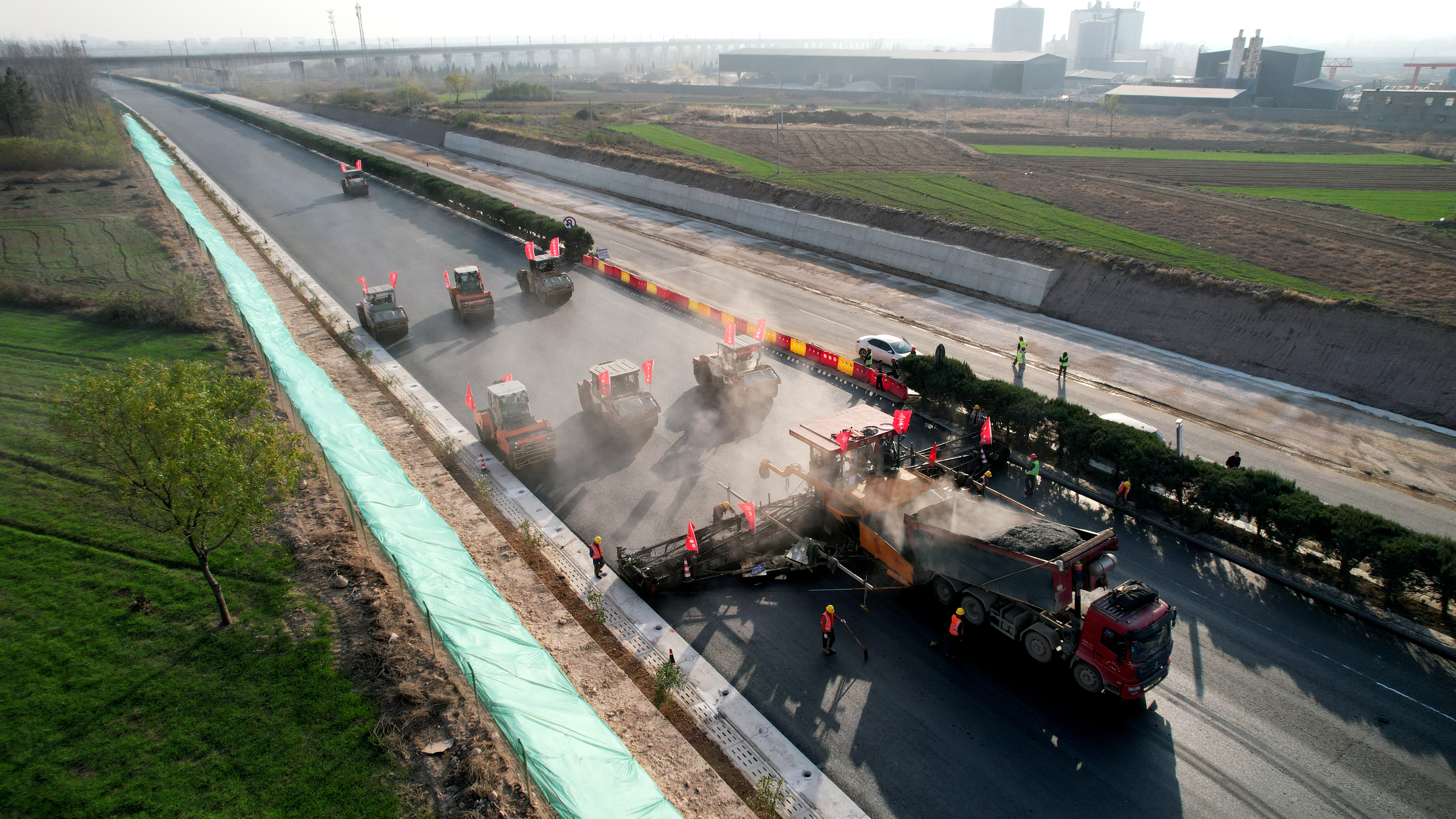 在交通動(dòng)脈擴(kuò)容一線(xiàn),技術(shù)賦能跑出“加速度”。G3京臺(tái)高速,車(chē)流如織,項(xiàng)目工期緊、任務(wù)重、技術(shù)挑戰(zhàn)多。11月30日,項(xiàng)目主線(xiàn)左幅瀝青上面層實(shí)現(xiàn)全線(xiàn)貫通,標(biāo)志著這一關(guān)鍵戰(zhàn)役取得階段性勝利。勝利的背后,是超前的工藝試驗(yàn)與精細(xì)管控。項(xiàng)目大膽采用19米超寬幅攤鋪機(jī)進(jìn)行全斷面一次成型作業(yè),在全線(xiàn)率先完成SMA-13上面層試驗(yàn)段攤鋪。這不僅徹底消除了傳統(tǒng)并聯(lián)攤鋪的縱向接縫,更顯著提升了路面的整體平整度與耐久性能,為后續(xù)大規(guī)模高效施工奠定了堅(jiān)實(shí)技術(shù)基礎(chǔ)。從試驗(yàn)段成功到全線(xiàn)貫通,背后是原材料嚴(yán)格篩選、配比反復(fù)優(yōu)化、溫度實(shí)時(shí)監(jiān)測(cè)、工序無(wú)縫銜接的全程精細(xì)管控。