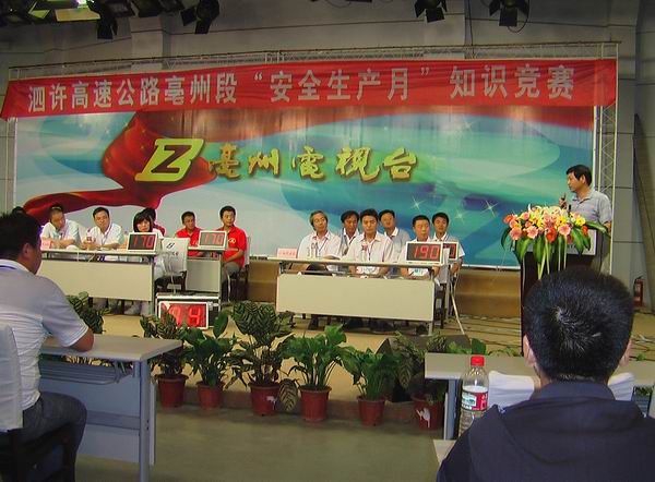 6月12日下午,在亳州市電視臺七樓演播廳舉辦了泗許高速亳州段“安全生產月”知識競賽,此次競賽由泗許高速亳州段建設辦舉辦,監理單位和各施工單位共六支隊伍參加了比賽。亳州市質量安全監督局副局長程權,泗許高速亳州段建設辦工程部部長蔡兵出席競賽并擔任競賽評委。