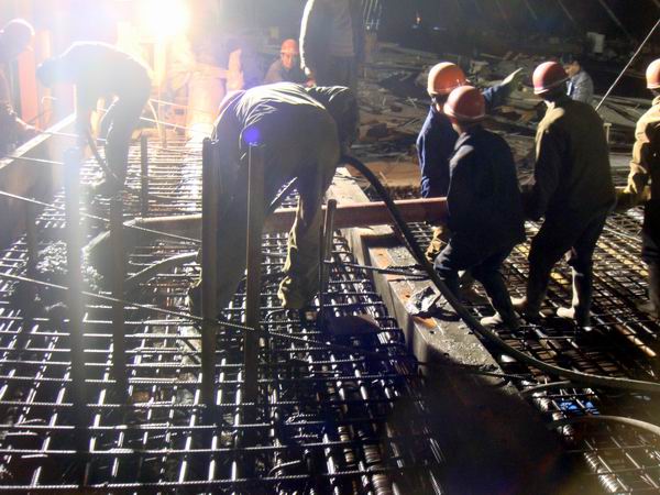 淠望路大橋主橋全長120米,共有15個節段,是整個大橋的重難點和關鍵控制性工程,全部采用前支點掛籃施工。由于施工技術含量高、施工難度大,關系到全橋的進度與形象,是全橋施工的重中之重。開工伊始項目部就高度重視,提出了“向主橋要進度、向引橋要形象”的口號;多次組織專家評審施工方案、優化施工工藝,特別是“塔梁并進”工藝的采用,極大地促進了工效,既縮短了工期又降低了成本。隨著工程的推進,項目部審時度勢的不斷優化整合施工資源配置:在施工力量、機械設備上優先滿足主橋施工需要。在搶時間趕進度的同時不斷強化現場安全生產管理,并嚴把質量關,特別是會同監控單位加強了對整橋線形控制,使之符合設計和施工技術規范要求,達到了預期效果。在工序無間隙、晝夜無間斷,質量有控制、安全有保障的良好狀態下,以七至八天每節段的速度全力推進主橋建設,圓滿的完成了主橋建設的各項任務。