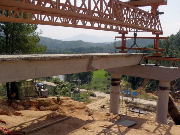 為了確保架梁工作的順利開展,項(xiàng)目部領(lǐng)導(dǎo)到現(xiàn)場(chǎng)指導(dǎo)架橋機(jī)的拼裝、檢驗(yàn)等工作,通過對(duì)架梁人員進(jìn)行分部分項(xiàng)技術(shù)交底,讓所有現(xiàn)場(chǎng)作業(yè)人員都能做到熟捻于心。經(jīng)過施工人員精心施工,努力奮斗,于10月2日完成架橋機(jī)拼裝,10月3日完成調(diào)試。10月5日,在項(xiàng)目部領(lǐng)導(dǎo)、監(jiān)理和駐地辦領(lǐng)導(dǎo)的共同指揮下,我標(biāo)段首片箱梁成功架設(shè)。現(xiàn)場(chǎng)鞭炮齊鳴,掌聲如雷,為國(guó)慶增添新的喜慶。